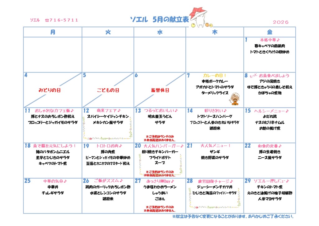 - 5月の献立表が完成しました!