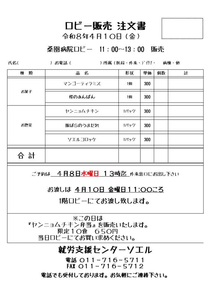 ロビー販売のお知らせ